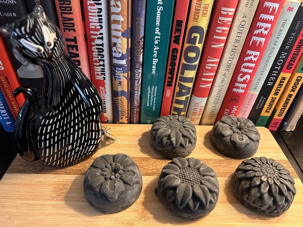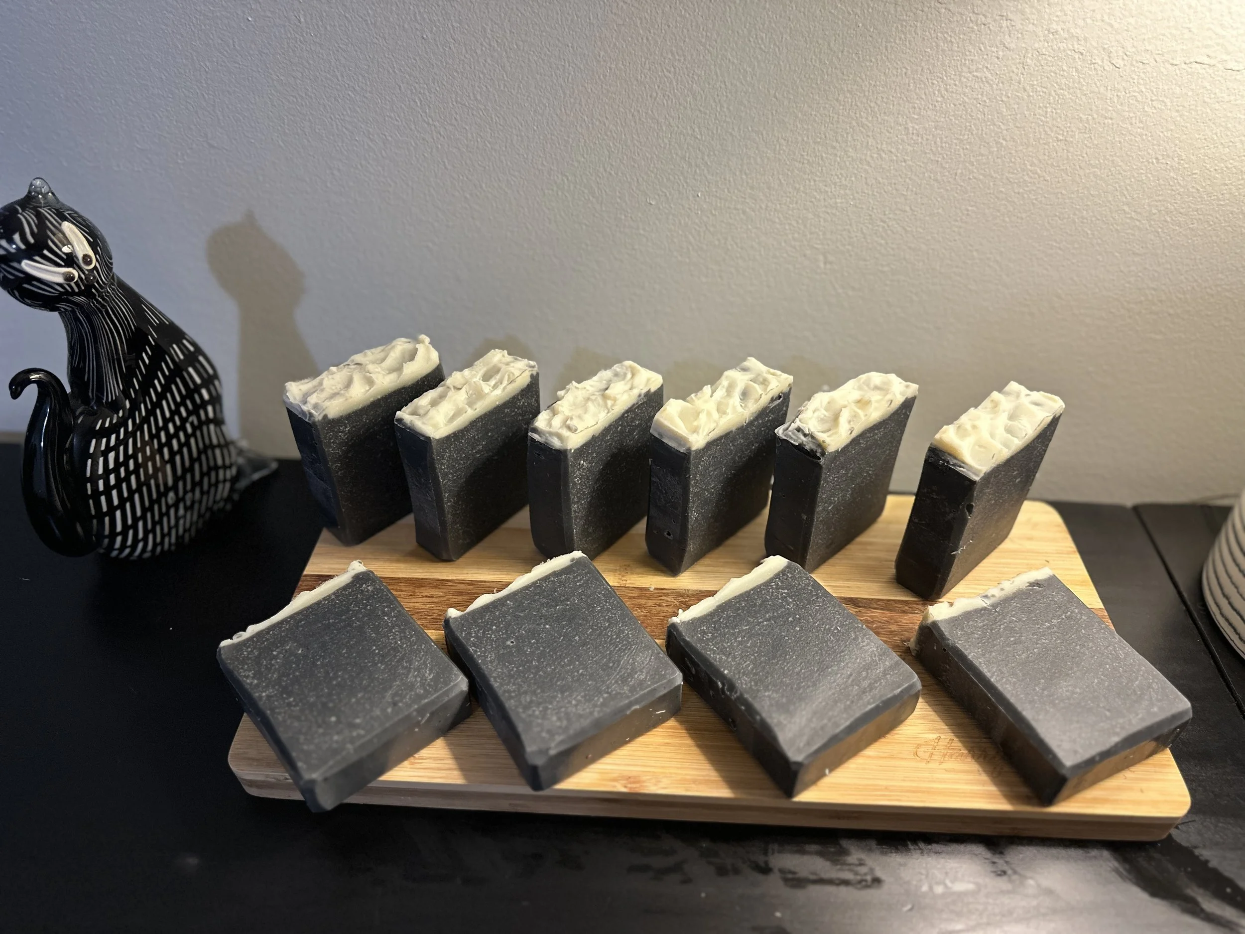 Ingredients: Saponified shea butter, coconut oil, olive oil, and castor oil. Water, coconut milk, fragrance oil, mica, kaolin clay, titanium dioxide, sodium lactate, tussah silk.